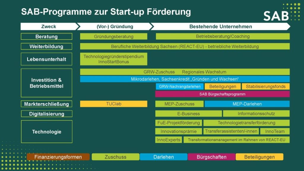 Der Freistaat Sachsen unterstützt tatkräftig Gründende im Aus- und Aufbau ihrer Unternehmen. Dafür werden Fördermittel in Form von Darlehen oder Zuschüssen zur Verfügung gestellt und Unternehmen aus ihrer Start-up- in die Markteinführungs- und Expansionsphase begleitet. So bietet auch die Sächsische Aufbaubank (SAB) Förderprogramme für GründerInnen und junge Unternehmen an.