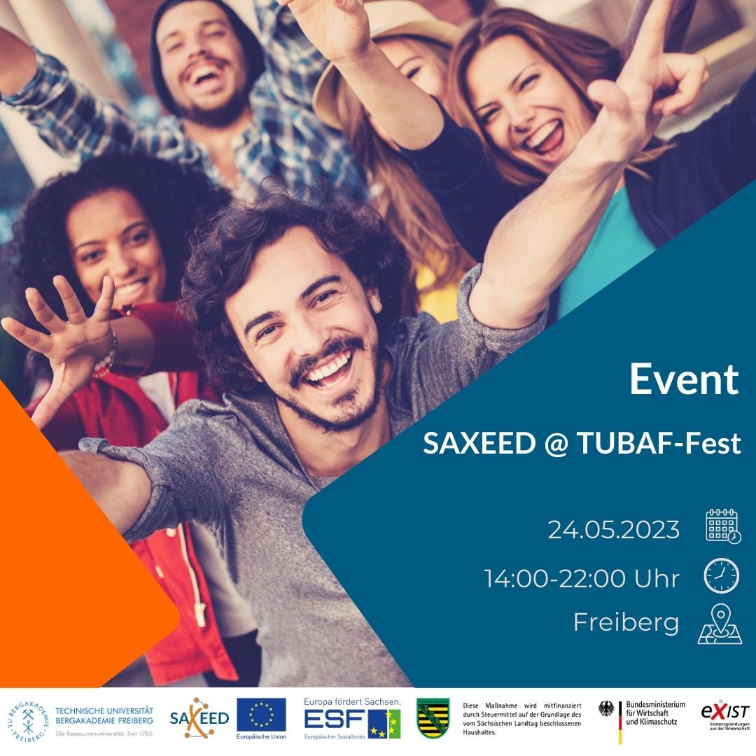 Diese und weiter Fragen beantwortet dir unser SAXEED-Team der TUBAF gern zum Fest für Studierende und Mitarbeiter. Ab 14 Uhr triffst du uns und erfolgreiche Gründerinnen und Gründer der TUBAF am Sonnensegel der Neuen Mensa.